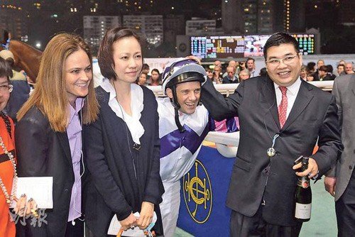 被斩死的百亿富商彭某(右一)为马主,图为其名下赛马"永顺益"于去年3月7日赢得头马时,他手持香槟与骑师合照。据女死者黄某生前向员工透露,黄不时陪伴男友到马场。(香港明报图)