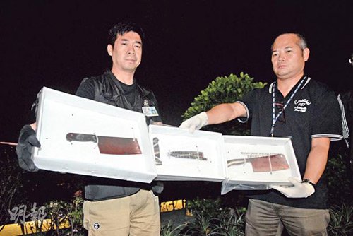 君临天下双尸命案中,49岁富商彭某被与他诞下一子的女伴乱刀斩死,身上有逾100多个刀伤,警方事后于单位检获两把染血菜刀及一把切肉刀香港明报图