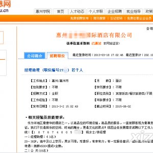 3月25日,惠州学院毕业生就业指导中心在其就业信息网上发布声明称,2013年3月初,金华悦国际酒店在该院就业信息网申请注册,考虑到其是惠州市知名企业,工作人员审核通过了其注册申请,“2013年3月18日17时2分,该酒店在就业信息网上发布了不良招聘信息;3月19日9时10分,网站工作人员发现后立即将其删除。”