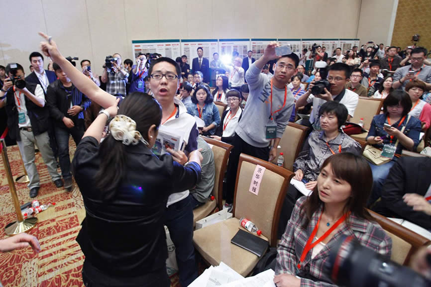 5月6日,农夫山泉在北京就产品标准问题召开新闻发布会。农夫山泉公司董事长钟睒睒在阐述时被《京华时报》记者打断,双方就标准问题进行了激烈争执。