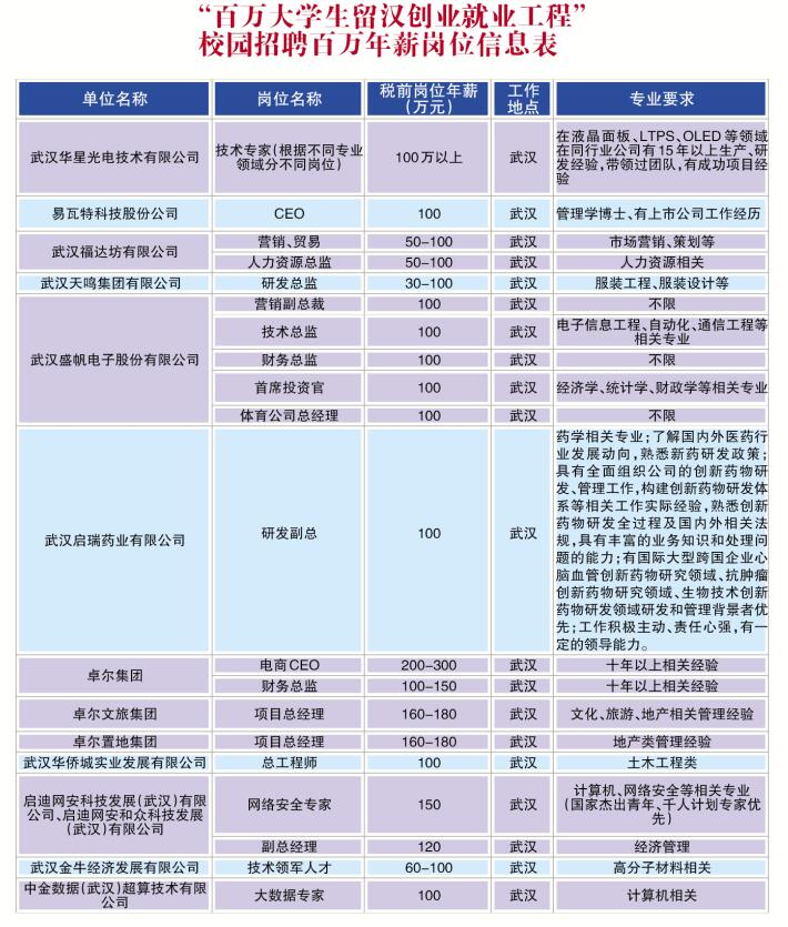 武汉市招才局副局长孙志军介绍,此次发布岗位最高年薪全国前列,推出年薪10万元的“高薪优岗”接近1万个,其中,年薪过100万元的123个以上,涵盖信息技术、互联网、大数据、生命健康等新兴产业,涉及华星光电、卓尔控股、启瑞药业等一批在汉知名企业。