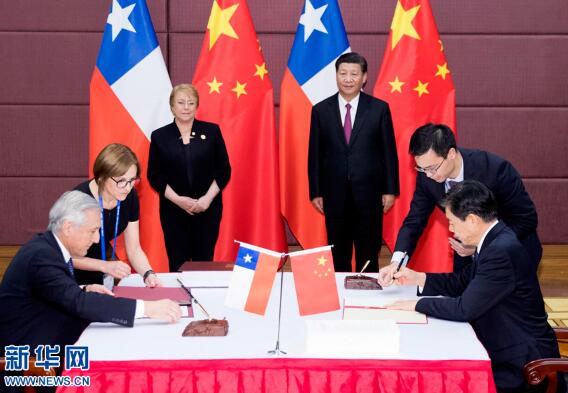 智利是第一个同中国签订自由贸易协定的拉美国家。2016年11月习近平对智利进行国事访问期间,同巴切莱特一起宣布启动两国自由贸易协定升级谈判。双方经过一年谈判,顺利达成自由贸易协定升级议定书。