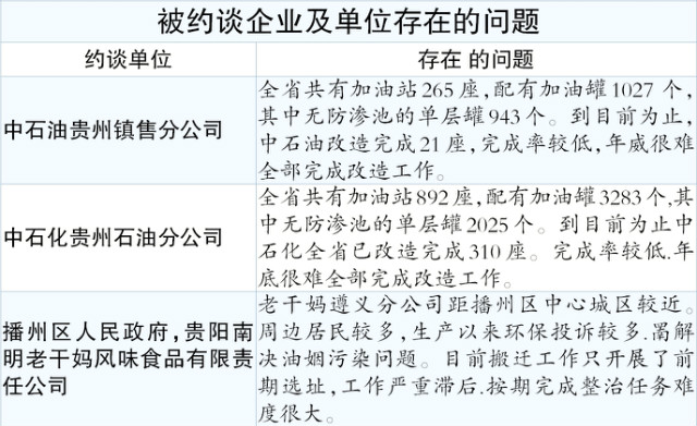 长江商报讯(记者 吴婷)11月9日,贵州省环保厅对中石油贵州销售分公司、中石化贵州石油分公司、老干妈等企业和单位存在的11个突出环境问题实施省级集中约谈,要求地方政府和各企业立即按照环保要求,限期完成整改。