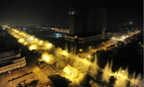 (2)研发了“高层(耸)建(构)筑物‘多向多次折叠’”、“高层建筑物‘定向倾倒、空中解体’”、“大型城市高架桥一次性连续塌落”和“大型群体建筑一次性整体爆破技术[18-19] ”等多项拆除爆破新技术,研发了“’点面结合、多点驱动、同网延时’爆炸水雾降尘技术”等爆破有害效应综合防控技术,丰富和发展了工程爆破理论技术体系。