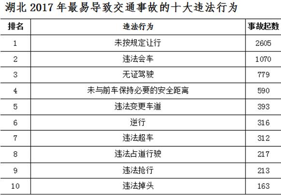 ¸ù¾Ý2017Äêºþ±±Ê¡¹«°²½»¹Ü¾Ö×îÐÂÊý¾Ýͳ¼Æ£¬´Ó2017Äê1ÔÂ1ÈÕÖÁ11ÔÂ20ÈÕ£¬ºþ±±Ê¡×îÈÝÒ×µ¼Ö½»Í¨Ê¹ʵÄÊ®´óÎ¥·¨ÐÐΪ,·Ö±ðÊÇ£ºÎ´°´¹æ¶¨ÈÃÐУ¬Î¥·¨»á³µ,ÎÞÖ¤¼ÝÊ»£¬Î´Óëǰ³µ±£³Ö±ØÒªµÄ°²È«¾àÀëºÍÎ¥·¨±ä¸ü³µµÀµÈ¡£