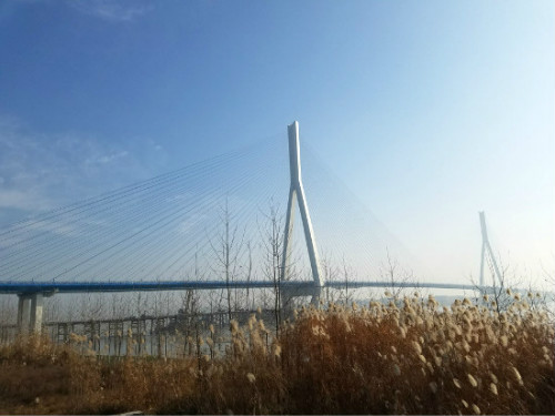 沌口长江公路大桥位于白沙洲长江大桥和军山长江大桥之间,起点接武汉市四环线西段,在武汉市经济技术开发区汉洪高速设互通衔接,过长江,经洪山区青菱乡,在江夏区青郑高速设互通衔接,终点接四环线南段。桥上视野开阔,极目远眺,可望见白沙洲长江大桥和军山长江大桥。桥下货轮匀速穿梭江面。步行在沌口长江大桥桥面,冬日暖阳照在身上带来懒洋洋的舒适感,已然忘却江面微风带来的丝丝寒意。46米宽的桥面,足有半个足球场大,给人的第一感觉是——舒坦。