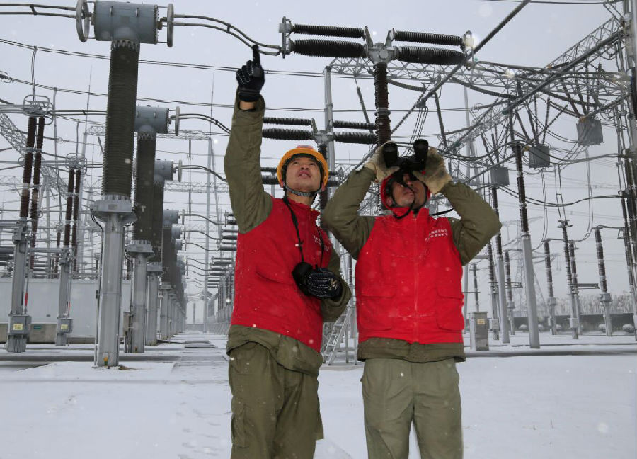 (1月4日,湖北西部迎来2018年首场暴雪,湖北电力检修公司员工在荆门市500千伏斗笠变电站冒着暴雪巡视站内设备,保障极寒恶劣天气条件下三峡电力外送枢纽变电站的安全稳定运行。)