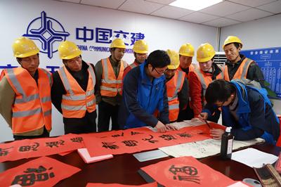 今天,武汉飘起鹅毛大雪,气温低至零下,而二航局华中·中交城项目部会议室里却喜气洋溢,春意萌动。原来,为弘扬传统文化,营造团结奋进、喜庆祥和的氛围,项目部特邀二航局青年书法家李帅现场为工人们写春联,送祝福,送温暖。