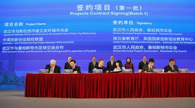 现场签约武汉市与斯旺西市建立友好城市关系、中英创新创业院校联盟、武汉市与曼彻斯特市足球交流合作、第一太平戴维斯物业顾问(武汉)有限公司项目、迈凯轮汽车销售项目、泰康在线总部大厦设计项目、远大医药改良型环孢素A滴眼剂项目、英国华盟跨境电商(中国总部)项目、威尔斯三一圣大卫大学武汉理工学院项目等9个项目。