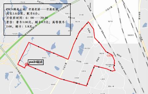 PW24路微循环为黄陂横店地区的首条循环线,线路起、始点都在横店大街空港花园,全线5.6公里,开班时间为上午6:00,收班时间为晚上8:30分。沿途经过横店大街空港花园、横店大街临空幼儿园、横店大街川龙大道口、横店大道川龙大道口、横店大道两岗街、园春街横店中学、园春街横店幼儿园、园春街横店小学、中兴街园春街口、中兴街老工商所、前进大街百合家园、前进大街横店街道办事处、前进大街宏民巷、前进大街生鲜菜场、川龙大道横土公路口、川龙大道冶金、中兴街建国社区、中兴街临空小学、空港花园三期、空港花园等19个站点。线路执行一票制:普通车型1.0元/人次(刷卡0.9元/人次);高等级(空调)车型2.0元/人次(刷卡1.8/人次)。
