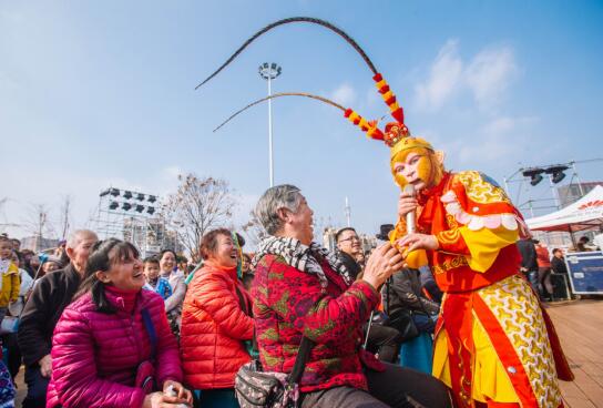 随后的舞狮表演掀起了全场高潮,四只狮子跳、转、腾、扑,一会“穿裆过桥”,一会“狮子望月”,一会挠挠痒、抖抖毛、啃啃爪……时而威猛,时而俏皮。还走下舞台与观众亲密互动,现场观众争相摸“狮子头”求好运。美猴王孙悟空也不甘示弱,走下舞台找师傅、求掌声等更是惹得观众开怀大笑,不少观众掏出手机拍照。