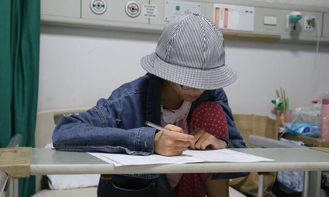 患重病住院的詹同学是该校会计专业大一学生,今年4月底确诊为肿瘤,后一直在省人民医院接受住院治疗。住院期间,詹同学一直挂念着学业。在治疗之余,她克服病痛的折磨,还时常翻看专业教材,通过qq、微信和老师、同学交流专业问题。她看到同班同学在班级群里谈论考试的话题后,便勇敢地向老师提出了希望能正常参加考试的请求。老师们被她好学和顽强的精神所感动,于是,学校专门为她在病房设立了一个人的考场。