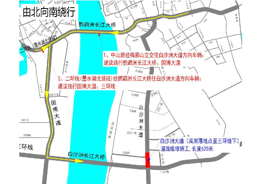 ¶þ»·Ïßīˮºþ±±Â·¶Î¾ðÐðÄÖÞ³¤½´óÇÅÍù°×ɳÖÞ´óµÀ·½Ïò³µÁ¾£¬ÈÆÐйú²©´óµÀ¡¢Èý»·Ïß¡£
