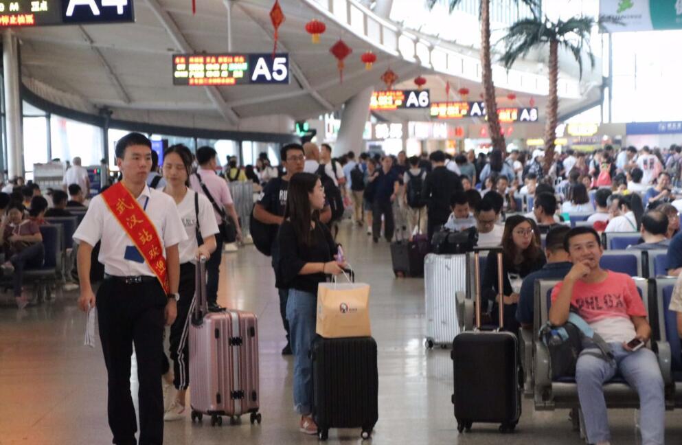 为做好假期客流运输服务,中国铁路武汉局集团有限公司大力推进“高铁网+互联网”融合服务,利用官方微博、微信和12306网站平台做好列车开行等信息发布,方便旅客出行;在各客运站发放文明出行宣传折页,开展“祝福语送给伟大的祖国”签名和发起“文明出行,从我做起”倡议活动,组织“文明巡视员”在进口、广厅、候车室做好旅客的帮困助行以及文明引导工作;汉口站开启了35个人工窗口和52台自动售取票机,在车站广场、进站地铁口、地下售票室以及汉宜线六个车站分别设置18个“心连心”服务台,打造“一处受理全站联动,一站受理七站联动”的立体化服务链,为老弱病残旅客提供进站、候车、上车等环节的服务;武汉站在西广场设置送客社会车辆、出租车的“高峰日落客区”,占地面积近4000平方米左右,设置5车道,同时容纳60台车停靠,畅行旅客出行;武昌站用61面国旗装扮车站,营造浓浓的节日氛围,并在现有自助售取票机40台、专用自助取票机23台的基础上,增设10台新型自助取售票机设备,15秒完成取票,缓解客流高峰时段旅客购、取车票排队拥堵情况。武汉客运段在多趟列车上,开展歌咏祖国、与祖国共度生日、文艺表演等活动,让旅客出行体验更美好。