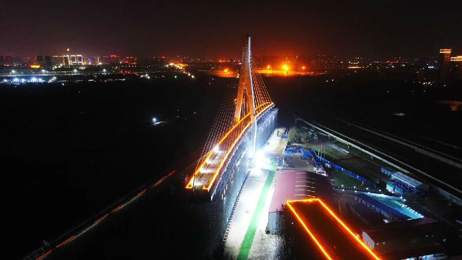 长江商报讯( 记者 熊辉 通讯员 隋业辉 陈嘉伦 徐正荣 曹文方 ) 今日(10月24日)凌晨零点55分至1点45分,由中交二航局承建的郑万铁路,最大纵坡最大偏心曲线转体斜拉桥,长341.5米,转体长度256米,高度88.94米,球铰偏心84.7厘米,重量1.65万吨,相当于将一艘“轻型航母”,在30米高空成功转体17度,耗时50分钟,实现了对徐兰高铁的完美跨越。
