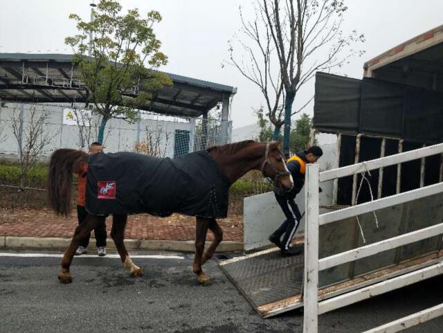在完成赛马的交付后,专业饲养员牵引着马匹在机场附近区域遛马,以使赛马适应“跨国旅行”后的新环境。随后,此批赛马由3辆EHS专业运马车送抵武汉商学院,进行为期1个月的检疫观察。
