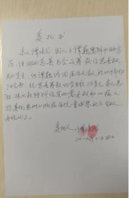 长江商报讯(记者 熊辉 通讯员 陈思 )“感谢各位好心人对我儿子的帮助,现在儿子去世了,我希望将。剩下善款及药品转赠给更需要帮助的人。”近日,武汉75岁的谭建尤将转赠善款委托书及价值7000余元药品,交给武汉亚洲心脏病医院的社工童伟琴。