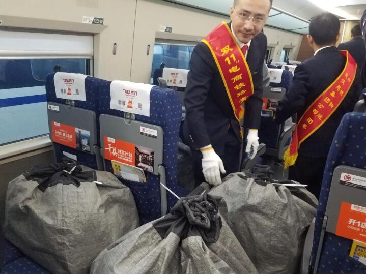 上午9:48,在武汉站,1吨多重的“双11”购物产品在中铁快运员工的有序安排下,乘上G692次高铁,将于当日16时到达山西太原,快递可当天送达顾客手中。据悉,当天共有9趟约10吨“双11”购物产品在武汉、汉口火车站通过“高铁极速达”服务运送至北京、上海、广州等地。