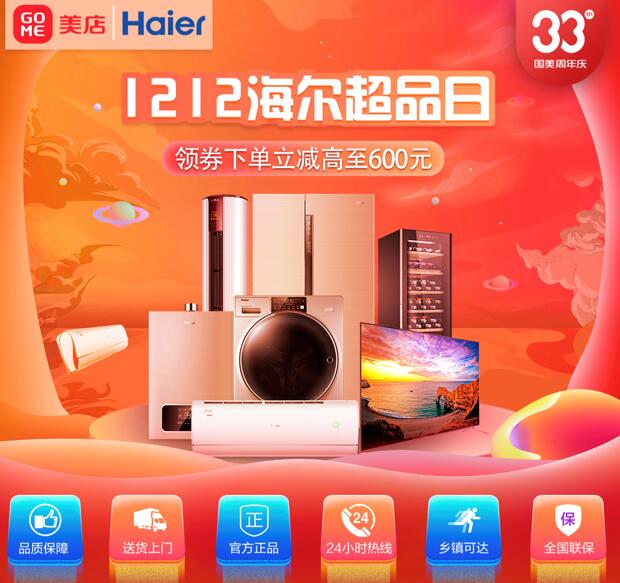 12月12日-15日,33周年生日之际,国美与海尔再度携手,国美美店带来海尔超级品牌日活动,涵盖了海尔冰箱、洗衣机、空调、电视、厨房卫浴等多个品类丰富产品,多重优惠福利、六大承诺保障、延保清洗服务。http://gome.cn/5Lvw9