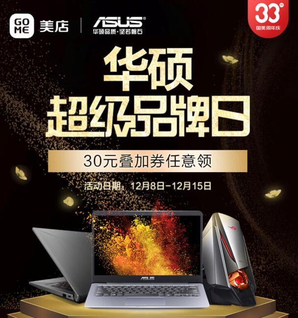 国美33周年华硕超级品牌日,游戏、办公、轻薄颜值笔记本电脑应有尽有,全场产品可领30元无门槛可叠加优惠券,相当于在原有优惠基础上再降30元。http://gome.cn/5LwCa