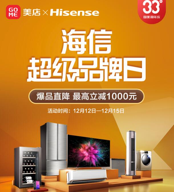 12月12日至15日期间,海信在国美美店推出超级品牌日活动,全场爆品直降,最高立减1000元。本次超品日期间,海信拿出数十款电视、冰箱、空调、洗衣机产品,给出高力度的优惠。其中多数产品为国美销售爆款,包括海信L5系列激光电视、VIDAA系列智能电视、海信旗下子品牌容声十字对开门冰箱BCD-452WSK1FPG、1.5匹变频空调KFR-35GW/A8X860N-A1、9公斤滚筒洗衣机XQG90-U1402FG等。http://gome.cn/5LwJf