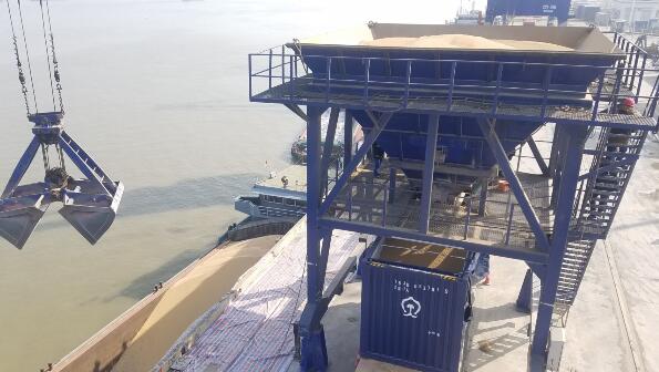 长江商报讯 (记者 熊辉 通讯员 孟立 )今日上午(12月27日),南美乌拉圭等地进口国内的2.2万吨散装大豆,从江阴港用船舶沿长江运抵黄石新港后,陆续转运到铁路敞顶集装箱,短暂集结后乘坐中国铁路武汉局集团有限公司开行的铁水联运班列,从罗家桥火车站一站直达成都,铁水联运班列全程仅需35小时,较以往水路运输至少缩短7天。今后,该班列采取每周三列“点对点”方式开行,标志着黄石—成都“散改集”粮食铁水联运班列实现常态化运营,成为长江翻坝“散改集”运输的标杆项目。