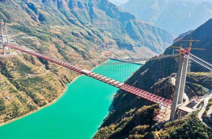 钢桁梁采用大型缆索吊设备逐个吊至300多米高空,并逐个连接起来。该缆索吊跨径超千米,是世界山区桥梁建设跨径最大的缆索吊,是承担大桥钢桁梁安装的关键利器。缆索吊的控制系统采用我国自主研发,目前世界最先进的智能化集成控制及远程监控系统。钢桁梁杆件采用工厂化制造、连续立体式预拼装,通过汽车运输至现场,再利用龙门吊拼装成吊装节段。2019年10月19日,首榀钢桁梁成功吊装,经过约3个月,大桥所有钢桁梁吊装完成。