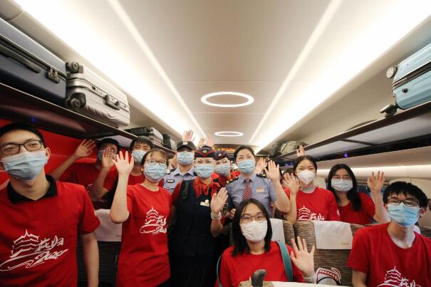13时30分,他们搭乘的G516次高速列车缓缓驶出武汉站1站台。这些风华正茂的大学生透过高速列车上的玻璃窗纷纷向站台工作人员挥手告别,表示感谢。