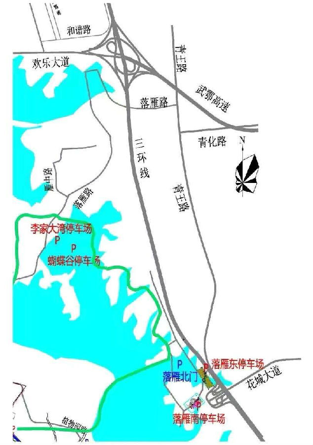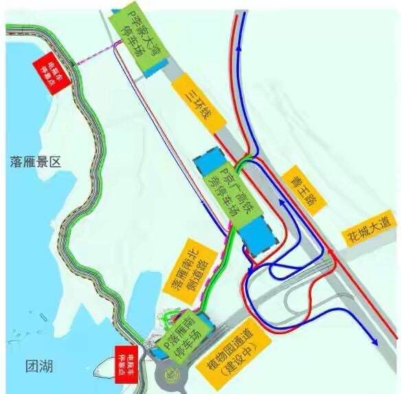 ´Óĥɽ½øÈëÂ̵ÀµÄ³µÁ¾Óöµ½Óµ¶Âʱ£¬¿ÉÒÔͨ¹ýÍÅɽËíµÀÈÆÐÐÓ÷¼Òºþ·¡¢çóè¤Â·ÉÏÈý»·Ïß¡¢ »¨³Ç´óµÀ³ö¿Úµ½´ïÂäÑã¾°Çø½øÈëÂ̵À¡£