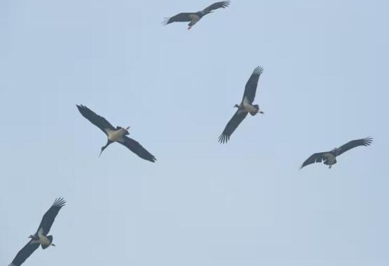武汉市观鸟协会会长颜军告诉记者,2014年12月,他们首次在天兴洲观测到黑鹳。此后连续6年的冬春季,都记录到黑鹳在天兴洲越冬。它们每年10月下旬到达,次年4月陆续离开,在岛上度过5个月时间。今年10月29日,协会的调查员在天兴洲首次观测到南迁至天兴洲越冬的黑鹳6只,标志着2020年至2021年候鸟越冬期的到来。通过最近三周每周一次的持续观测,18日当天记录到黑鹳最大个体数量达32只。国家Ⅱ级重点保护野生鸟类小天鹅、灰鹤、白琵鹭、普通鵟、游隼等,赤麻鸭、苍鹭、普通鸬鹚等也如期抵达天兴洲。
